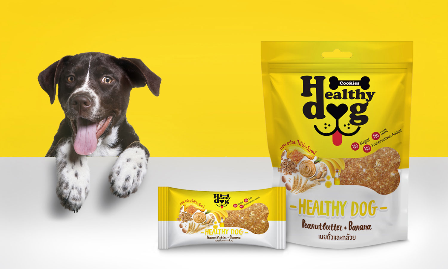 ขนมสุขภาพสำหรับสุนัข Healthydog เป็นขนมทีใช้วัตถุดิบคุณภาพและให้ประโยชน์ต่อสุนัขอย่างมากมาย เราจึงออกแบบโดยใช้รูปวัตถุดิบ ซึ่งเป็นจุดขายของสินค้า นำมาวางเรียงเป็นรูปกระดูก ที่สามารถสื่อถึงสุนัขได้ในทันที โดยไม่ต้องมีภาพสุนัขการใช้สีเหลืองเพื่อทำให้รู้สึกคึกคัก มีพลังงาน สุขภาพดี และเป้นการคุมโทนสีให้เข้ากับรูปวัตถุดิบต่างๆอีกด้วย